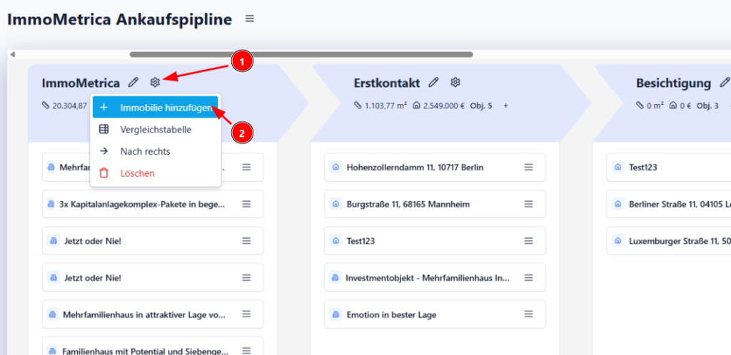 Ab sofort kannst du in deiner Ankaufs- oder Verwaltungs-Pipeline eine Immobilie direkt innerhalb einer Phase hinzufügen – zum Beispiel in „Angebot abgeben“ oder „Besichtigung“.