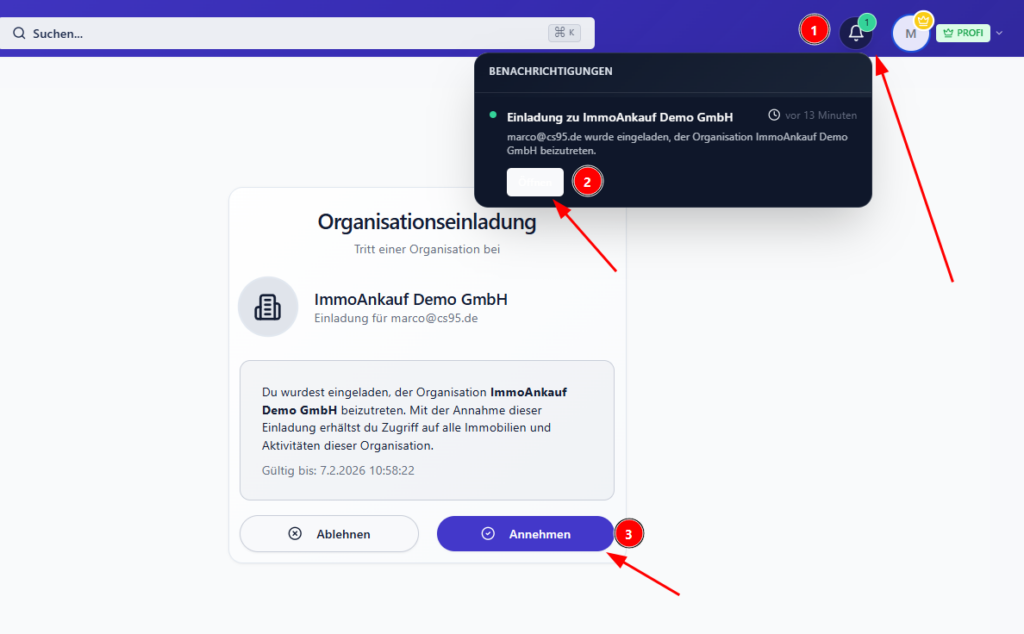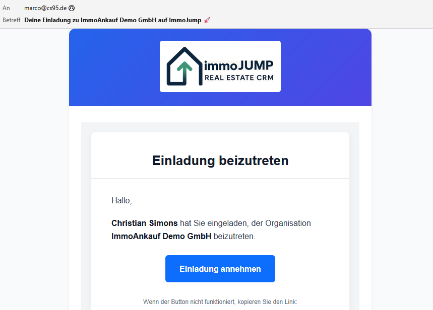 3a) Der Mitarbeiter erhält eine E-Mail und kann sich einen neuen ImmoJUMP-Account machen oder in einen bestehenden Account die neue Organisation hinzufügen.