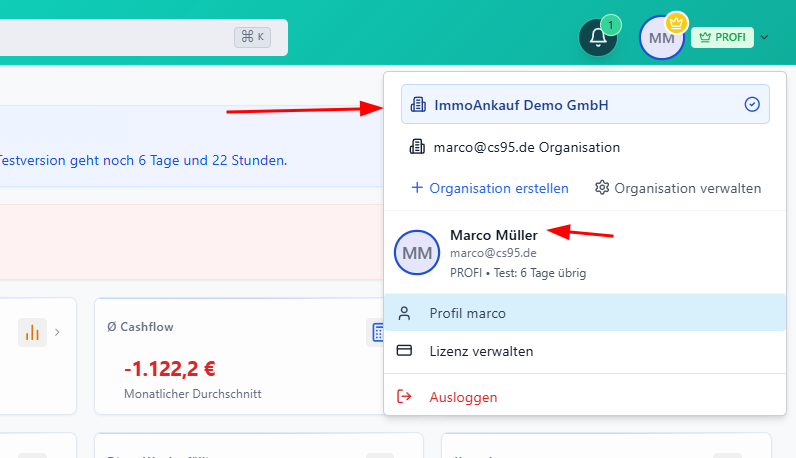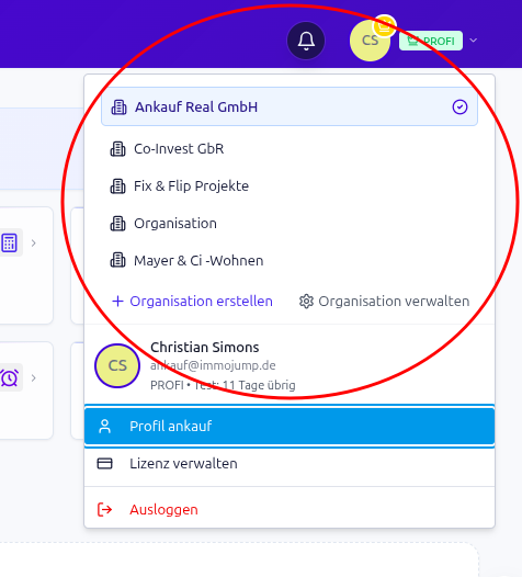 Eine Organisation ist der Rahmen fuer alle Daten: Immobilien, Kontakte, Deals, Dokumente, Pipeline-Workflows. Wer in der Organisation ist, sieht (je nach Rolle) alles Relevante.
