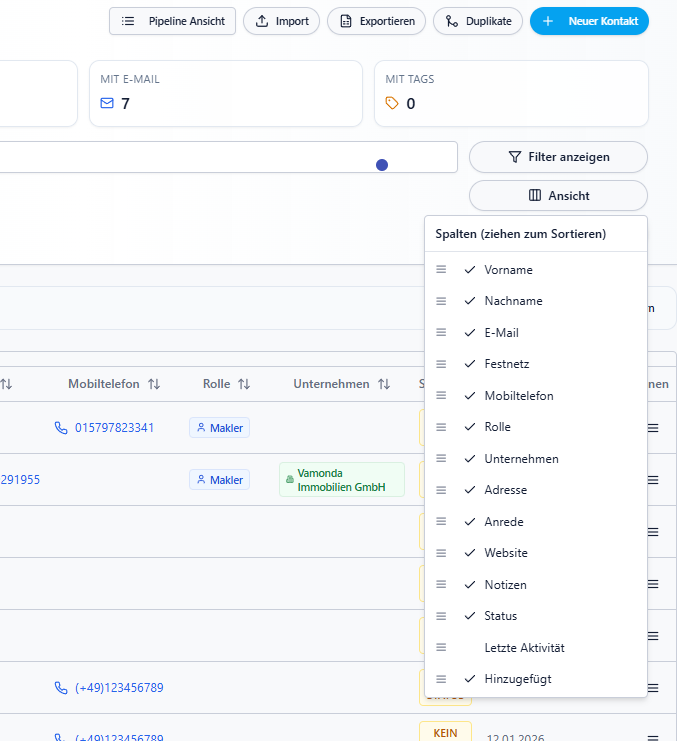 - Neue Spalten inkl. „Datum der letzten Aktivität“, Notizen, Website, Anrede, Adresse
